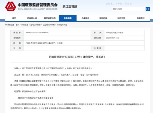 6月16日,证监会浙江监管局公布了澳创资产及其实控人、法人、总经理孙玉涛的行政处罚决定书。