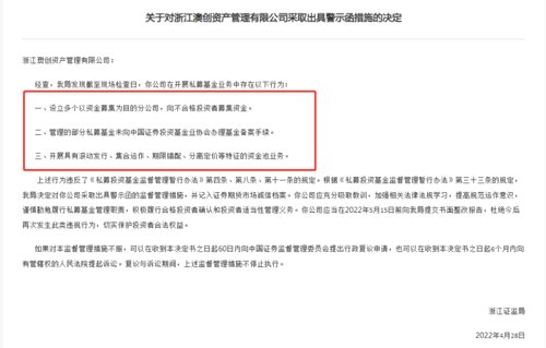 警示函显示,浙江监管局在对澳创资产私募业务情况现场检查中发现,公司存在设立多个以资金募集为目的分公司,向不合格投资者募集资金;管理的部分私募基金未向中国证券投资基金业协会办理基金备案手续;开展具有滚动发行、集合运作、期限错配、分离定价等特征的资金池业务等问题。