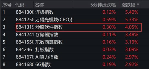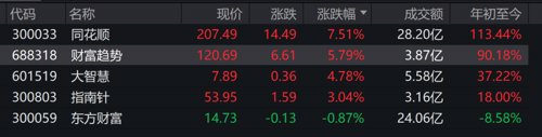同花顺一度涨超10%,财富趋势、大智慧等跟涨。