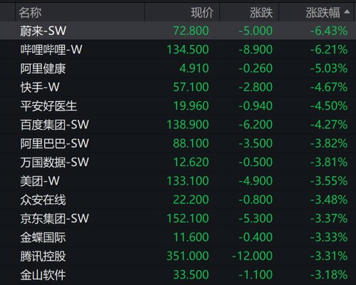 具体来看,蔚来、B站跌超6%,百度、快手跌超4%,阿里巴巴、美团、腾讯、京东、小米皆跌超3%;