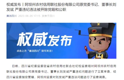 6月26日,四川纪委监委官微“廉洁四川”消息显示,阿坝州农村信用联社股份有限公司原党委书记、董事长刘发斌严重违纪违法,被开除党籍和公职。
