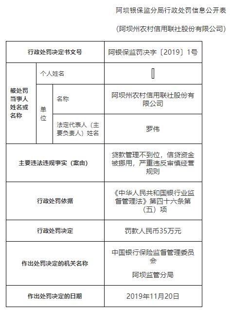 2019年12月,原银保监会阿坝监管分局对阿坝州农村信用联社股份有限公司处以35万元罚款,案由为:贷款管理不到位,信贷资金被挪用,严重违反审慎经营规则。