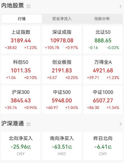 截止收盘沪指涨1.23%,深成指涨0.97%,创业板指涨0.26%。两市共4219只个股上涨,805只个股下跌。北向资金净卖出26亿元。