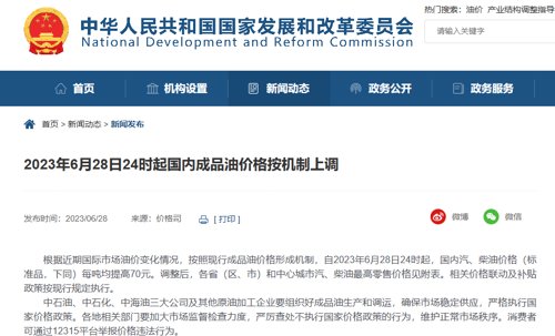 6月28日下午,国家发改委官宣新一轮油价调整情况:根据近期国际市场油价变化情况,按照现行成品油价格形成机制,自2023年6月28日24时起,国内汽、柴油价格每吨均提高70元。