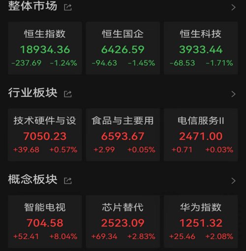 科技股方面,腾讯跌0.77%报333.港元,阿里巴巴-SW跌2.55%报82.2港元。京东集团-SW否认刘强东减持传闻,股价仍跌3.7%。百度集团-SW及哔哩哔哩-W分别跌4.2%及3.8%。美团-W及快手-W分别跌1.89%及2.65%。此外,据报道,网易-S游戏推AI巡逻员,首次用大模型技术防未成年人沉迷,网易跌0.13%。