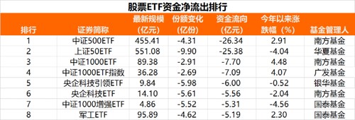 从资金净流出榜单看,8只股票ETF当周资金净流出超过5亿元,其中5只为宽基指数,另外3只为行业主题。