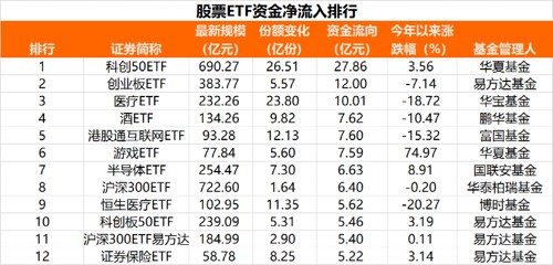 从资金净买入排行榜看,12只股票ETF上周资金净流入5亿元以上,其中5只为宽基,7只为行业主题。科创50ETF、创业板ETF、医疗300ETF、酒ETF等净流入资金位居前列。