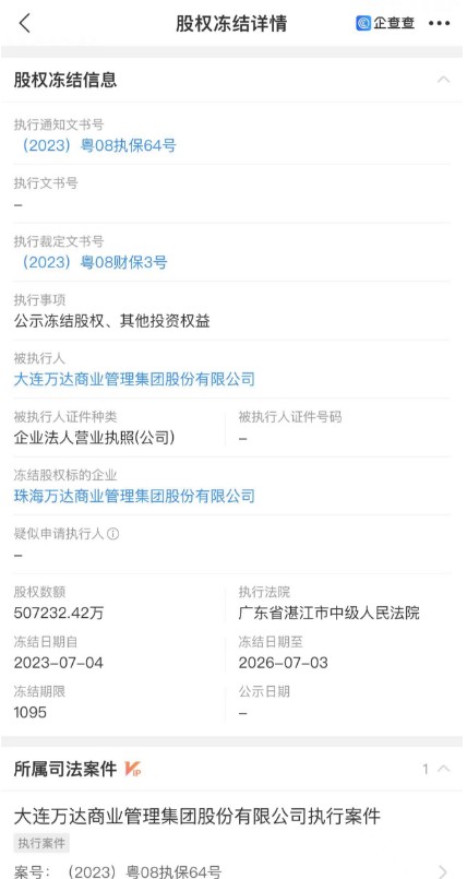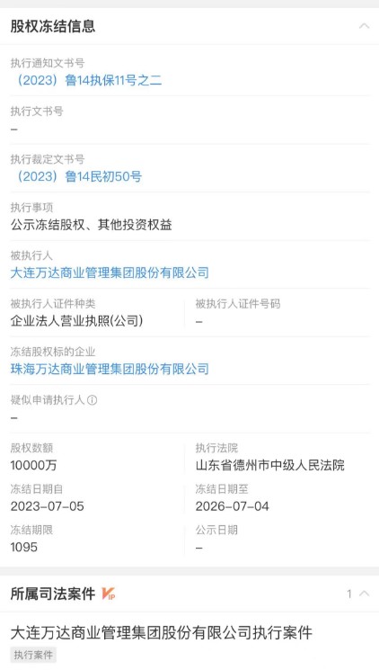 企查查APP显示,近日,珠海万达商业管理集团股份有限公司新增两条股权冻结信息,被执行人为大连万达商业管理集团股份有限公司,冻结股权数额分别为50.72亿、1亿人民币,冻结期限为自2023年7月4日至2026年7月3日、2023年7月5日至2026年月4日,执行法院为广东省湛江市中级人民法院、山东省德州市中级人民法院。