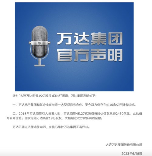 6月初,大连万达集团股份有限公司新增2则股权冻结信息,股权被执行的企业均为大连万达商业管理集团股份有限公司,被冻结股权数额合计约19.8亿元。