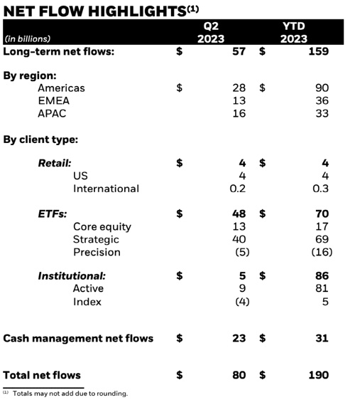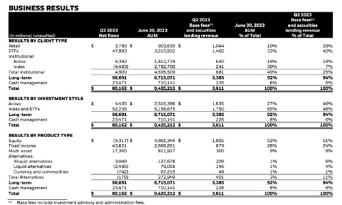 剔除现金管理工具外的长期限产品2023年2季度共实现净流入约570亿美元,其中美洲的客户贡献280亿美元,亚太客户贡献160亿美元,欧洲、中东、非洲(EMEA)地区的客户贡献130亿美元。拉长时间来看,2023年以来,美洲的客户贡献900亿美元,亚太客户贡献330亿美元,欧洲、中东、非洲(EMEA)地区的客户贡献360亿美元。