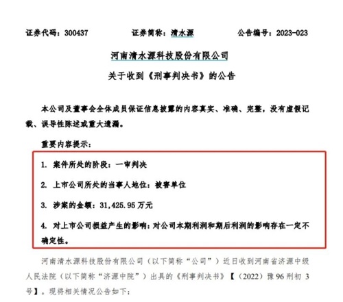公告显示,2019年7月,清水源对全资子公司同生环境开展日常审计过程中,发现同生环境原管理层存在利用职务便利非法侵占公司利益的行为,遂向公安机关报案。2021年8月13日,公司收到河南省济源市公安局送达的《移送起诉告知书》。随后,河南省人民检察院济源分院以合同诈骗、职务侵占、背信损害上市公司利益等罪名指控被告人宋颖标、钟盛、张永新,并向济源中级人民法院提起公诉。济源中级人民法院受理后,依法组成合议庭,公开开庭审理了本案。最新公布的一审判决结果显示,三名被告人均被重罚,其中最高被判有期徒刑18年,合计被处罚金950万元,并向清水源及子公司合计退赔超3亿元。其中,被告人宋颖标犯合同诈骗罪,判处有期徒刑15年,并处罚金500万元;犯职务侵占罪,判处有期徒刑8年;犯背信损害上市公司利益罪,判处有期徒刑6个月,并处罚金50万元。合并执行有期徒刑18年,并处罚金550万元。被告人钟盛犯合同诈骗罪,判处有期徒刑14年,并处罚金400万元;犯职务侵占罪,判处有期徒刑7年。合并执行有期徒刑16年,并处罚金400万元。被告人张永新犯职务侵占罪,判处有期徒刑3年,缓刑5年。同时,追缴被告人宋颖标、钟盛因合同诈骗的犯罪所得2.99亿元,退赔被害单位清水源;追缴被告人宋颖标、钟盛因职务侵占的犯罪所得1284.65万元,退赔被害单位子公司河南同生环境。追缴背信损害上市公司利益的违法所得200万元,退赔被害单位河南同生环境。值得注意的是,截至今年一季度末,前述被告人中,宋颖标、钟盛仍为公司第二、第三大股东,持股数量分别为700万股、486万股,合计持有1186万股股份,如按7月18日收盘价估算,持股市值约为1.81亿元。