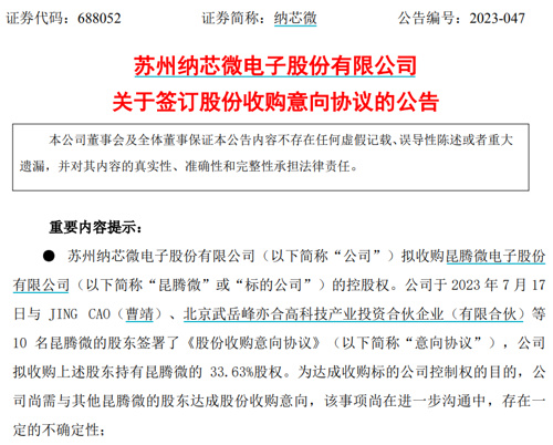 根据公告,纳芯微与JING CAO(曹靖)等10名昆腾微的股东签署协议,拟通过现金方式收购昆腾微33.63%股权,以获得后者的控制权。