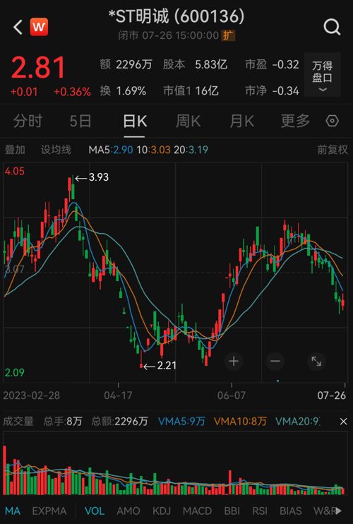 截至7月26日收盘,*ST明诚股价收报2.81元,涨幅0.36%,最新市值16亿元,一季度末公司股东总户数有2.15万户。