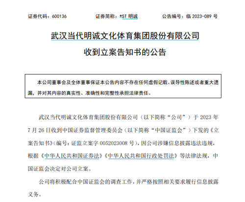 7月26日晚间,*ST明诚发布公告称,因公司涉嫌信息披露违法违规,中国证监会决定对公司立案。