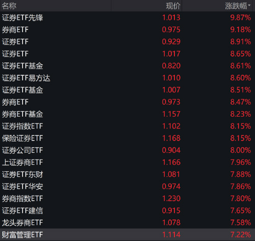 从今日股票ETF二级市场表现来看,“牛市旗手”券商行业主题ETF涨幅霸屏。