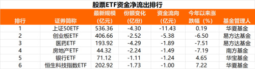 其中,华夏上证50ETF当日份额减少4.30亿份,至202.25亿份,资金净流出11.43亿元;易方达创业板ETF份额减少2.52亿份,至190.88亿份,资金净流出5.38亿元;易方达医药ETF份额减少4.29亿份,资金净流出1.89亿元。此外,南方房地产ETF、华宝银行ETF、华夏恒生科技指数ETF净流出均在1亿元以上。