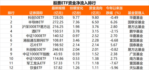 从资金净买入排行榜看,周四当天,12只股票ETF资金净流入1亿元以上,其中6只为宽基,6只为行业主题。科创50ETF、半导体ETF、沪深300ETF、酒ETF、中证1000ETF等净流入资金位居前列。