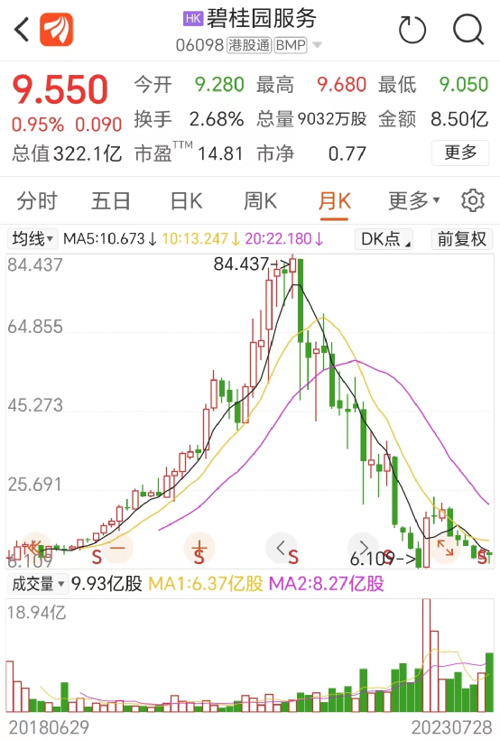 目前,碧桂园服务总市值约为322亿港元,股价9.55港元。