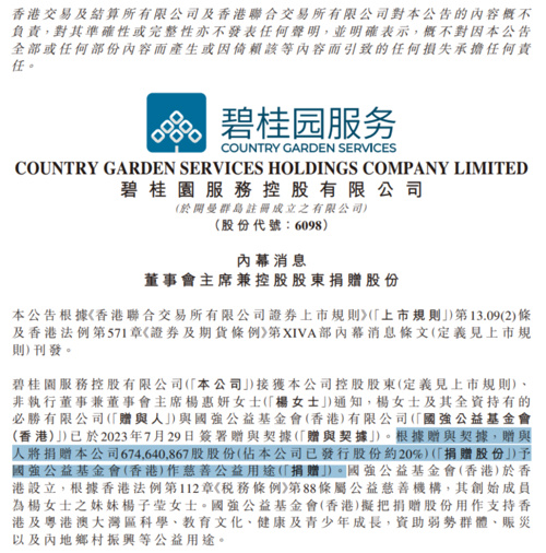 据杨惠妍实际控制的碧桂园服务(06098.HK)7月30日晚公告,公司控股股东、董事会主席杨惠妍向国强公益基金会捐赠67464.0867万股股份,国强公益基金会拟把捐赠股份用作支持香港及粵港澳大湾区科学、教育文化、健康及青少年成長等公益用途。