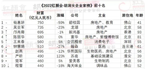 2022年12月发布的《2022胡润女企业家榜》显示,在财富缩水1100亿后,杨惠妍仍然以750亿元第十次成为中国女首富。