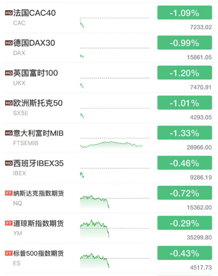 英国富时100指数跌幅达1.1%,意大利富时MIB指数跌幅达1.00%,德国DAX指数跌近1%,法国CAC40指数跌0.89%,欧洲斯托克50指数跌0.84%。