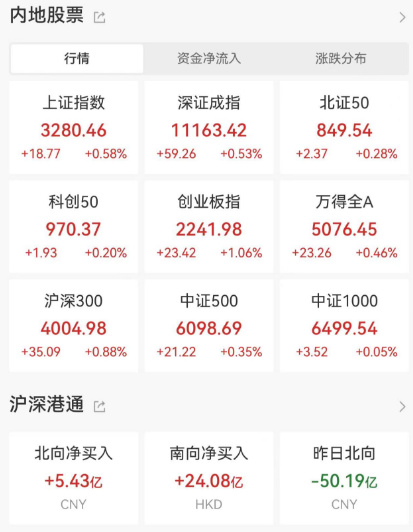 A股午后大逆转,直线拉升,截止收盘沪指涨0.58%,深成指涨0.53%,创业板指涨1.06%。北向资金净买入5亿元。共2086只个股上涨,2928只个股下跌。