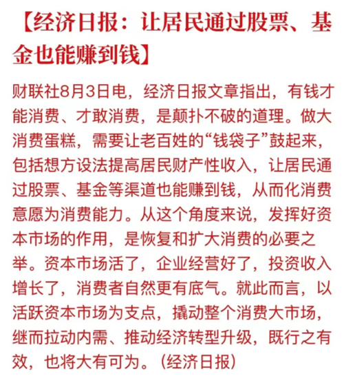 此外,经济日报发文称让居民通过买股票、基金也能赚到钱,是扩大消费必要之举。