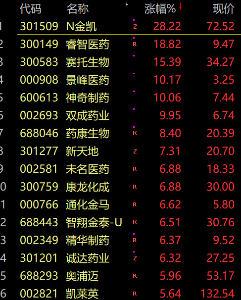 医药股集体拉升,创新药方向领涨,神奇制药、景峰医药、双成药业涨停,睿智医药、赛托生物、诺思格涨超10%。消息面上,美国顶级癌症治疗和研究机构发布公告称,在临床前研究中,该机构科学家开发出一种能杀死所有实体恶性肿瘤(癌瘤)的靶向化疗药物。
