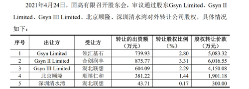 招股说明书显示,2021年4月,固高有限(固高科技前身)股东Gsyn Limited、Gsyn II Limited、Gsyn III Limited、北京顺隆、深圳清水湾对外转让公司股权。