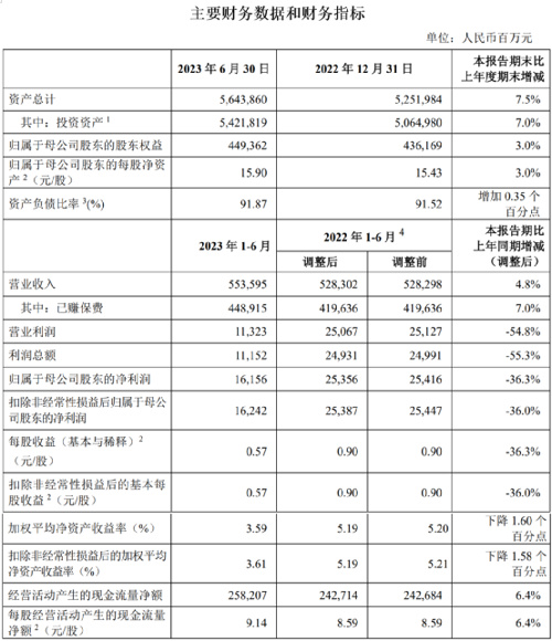 截至本报告期末,公司总资产达 5.64 万亿元,投资资产达 5.42 万亿元,内含价值达1.31万亿元,均稳居行业首位;综合偿付能力充足率和核心偿付能力充足率分别为 204.23%、140.43%,继续保持较高水平。公司拥有长险有效保单件数达 3.26 亿份。