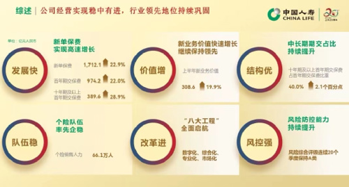根据中国人寿半年报,2023 年上半年,中国人寿坚持“稳增长、重价值、优结构、强队伍、推改革、防风险”的经营策略,坚守保险本源,坚持高质量发展,积极抢抓行业复苏发展机遇,攻坚突破、开拓创新,整体经营稳中有进,市场领先地位持续稳固。