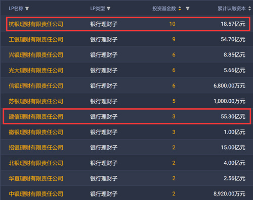 其中,杭银理财出手次数最多,投资的基金高达10只;建信理财虽然出手次数只有3次,但是认缴资本却是最多的,超过55亿。