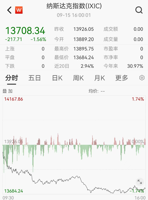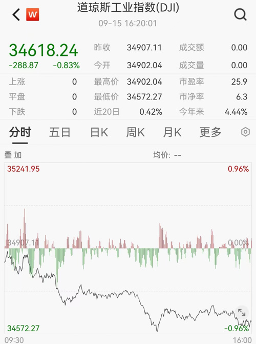 美东时间9月15日,美国三大股指全线收跌。截至收盘,道指跌0.83%,报34618.24点;标普500指数跌1.22%,报4450.32点;纳指跌1.56%,报13708.34点。本周,道指涨0.12%,标普500指数跌0.16%,纳指跌0.39%。