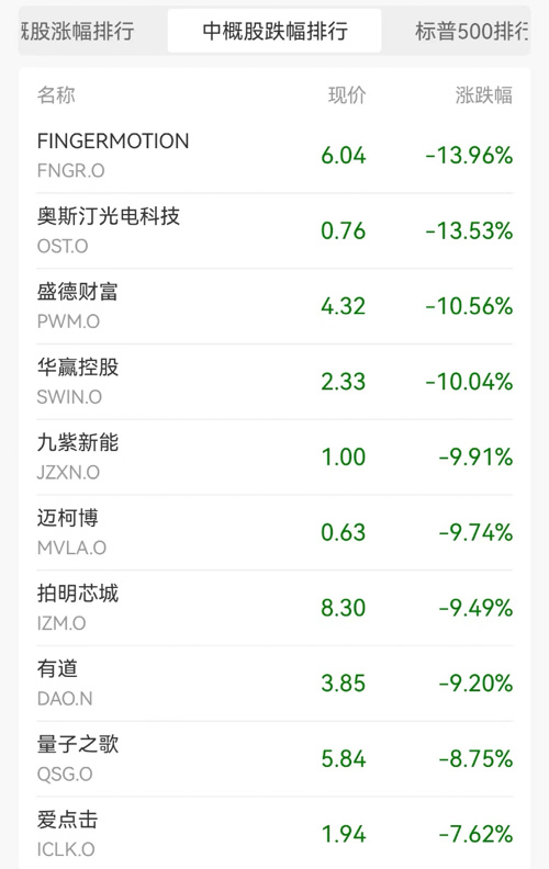 热门中概股多数下跌。FINGERMOTION跌-13.96%,奥斯汀光电科技跌13.53%,盛德财富跌10.56%,领跌中概股。