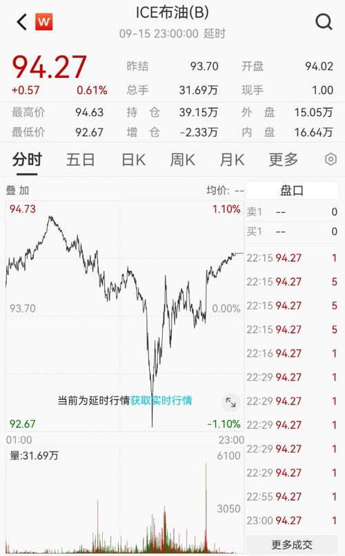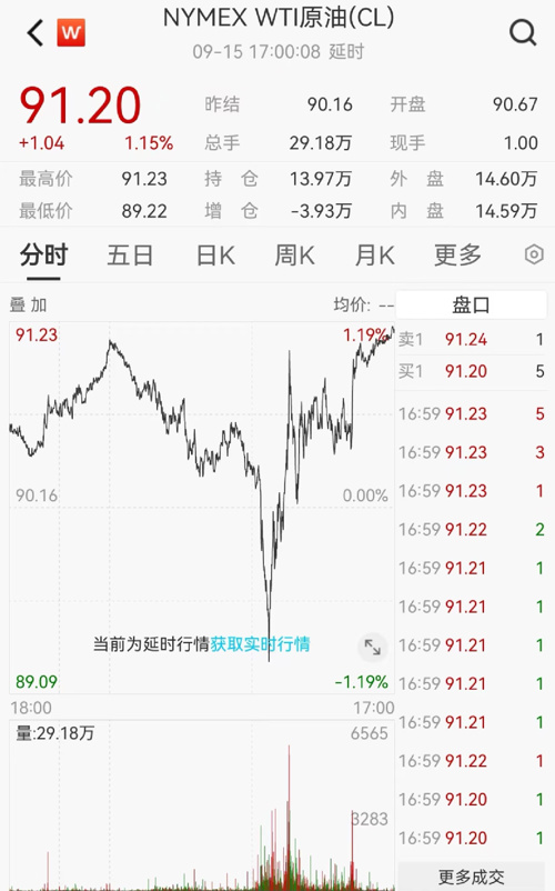 美东时间9月15日,国际油价全线上涨,美油10月合约涨1.15%报91.2美元/桶,周涨4.22%;布油11月合约涨0.59%报94.25美元/桶,周涨3.97%。