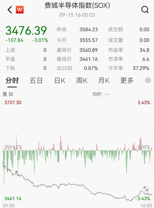 美东时间9月15日,美国上市芯片股全线下跌,费城半导体指数跌3.01%,该指数30只成分股仅一只微涨。半导体巨头英伟达市值一夜蒸发超3000亿元!