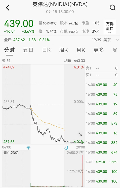 周五,半导体巨头英伟达开盘一路向下,最大跌幅达4.01%,收盘跌3.69%,报439美元,市值1.08万亿美元。其市值一夜蒸发415亿美元(约人民币3019亿元)。