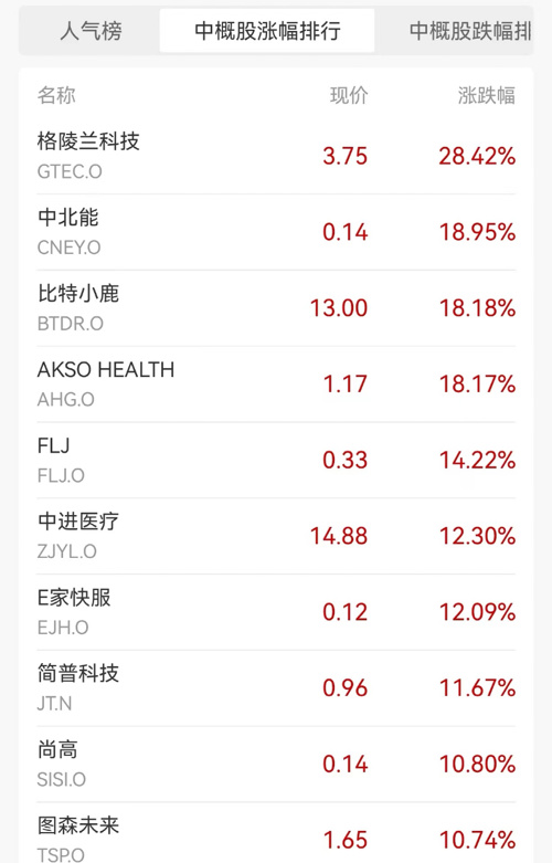 涨幅方面,格陵兰科技涨28.42%,中北能涨18.95%,比特小鹿涨18.18%,领涨中概股。