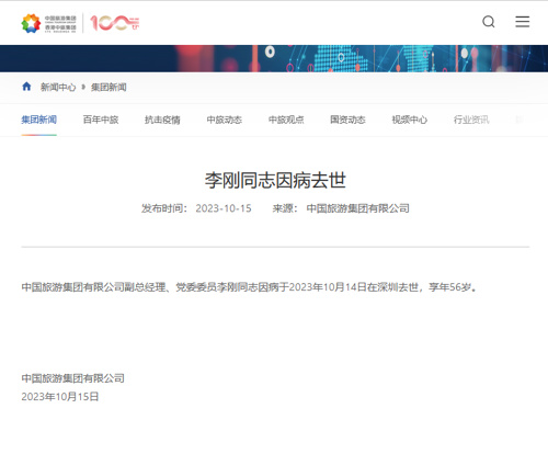 中国旅游集团、香港中旅集团15日也发布讣告:中国旅游集团有限公司副总经理、党委委员李刚同志因病于2023年10月14日在深圳去世,享年56岁。