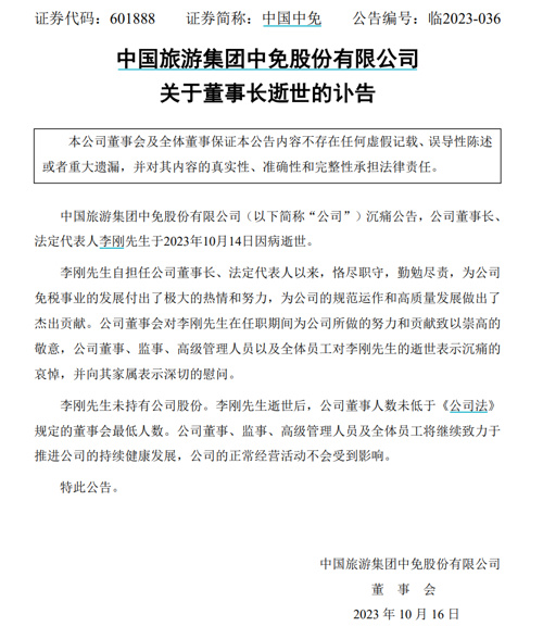 10月15日,免税龙头中国中免(601888)10月15日公告,公司董事长、法定代表人李刚于2023年10月14日因病逝世。