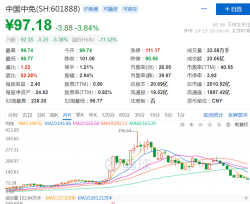 截至目前,中国中免最新市值为1996亿元。