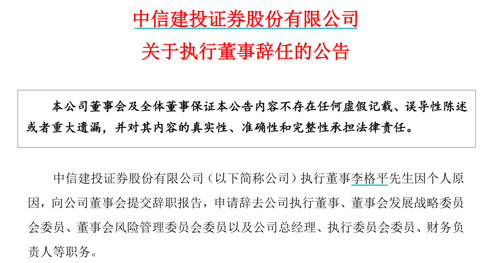 6月1日晚间,中信建投发布公告称,总经理李格平因个人原因,向公司董事会提交辞职报告,申请辞去公司执行董事、董事会发展战略委员会委员、董事会风险管理委员会委员以及公司总经理、执行委员会委员、财务负责人等职务。
