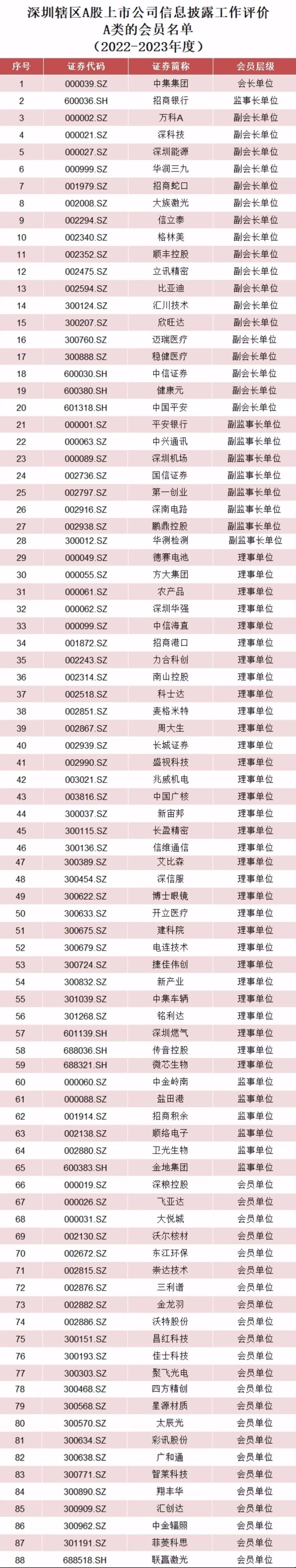近日,深沪证券交易所相继公布了2022-2023年度上市公司信息披露工作评价结果。据统计,深圳上市公司协会会员获评A级的共88家,其中包括会长单位1家、监事长单位1家、副会长单位18家、副监事长单位8家、理事单位31家、监事单位6家、会员单位23家。