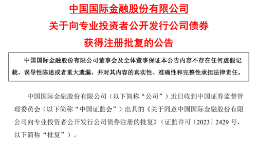 10月31日晚间,中金公司发布公告称,中国证监会同意公司向专业投资者公开发行面值总额不超过200亿元公司债券的注册申请。