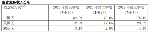 从区域收入结构来看,中国区的业务收入占比继续增加,从二季度的79.6%扩大至三季度的84%。