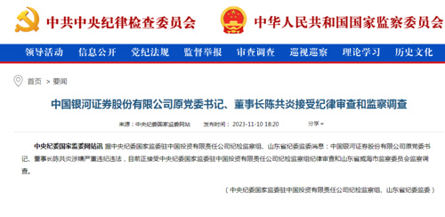 中国银河证券股份有限公司原党委书记、董事长陈共炎涉嫌严重违纪违法,目前正接受中央纪委国家监委驻中国投资有限责任公司纪检监察组纪律审查和山东省威海市监察委员会监察调查。