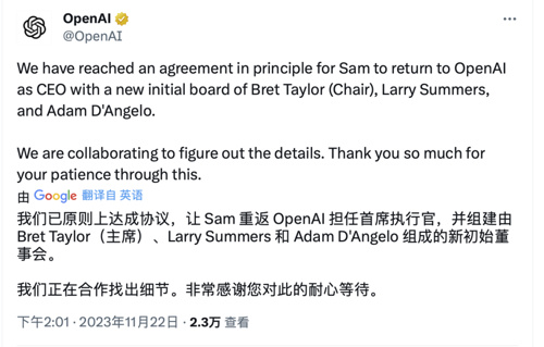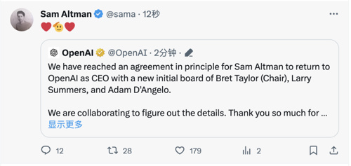 刚刚,OpenAI 宣布, Sam Altman 将重新回归 OpenAI 担任 CEO。