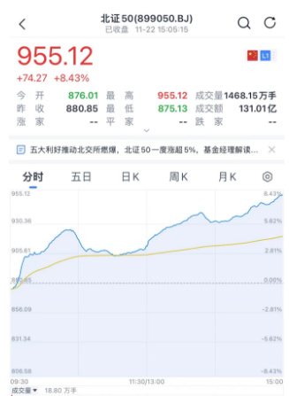 北证50继续爆出历史成交天量,成交130亿!指数大涨超8%,刷新昨日高点。