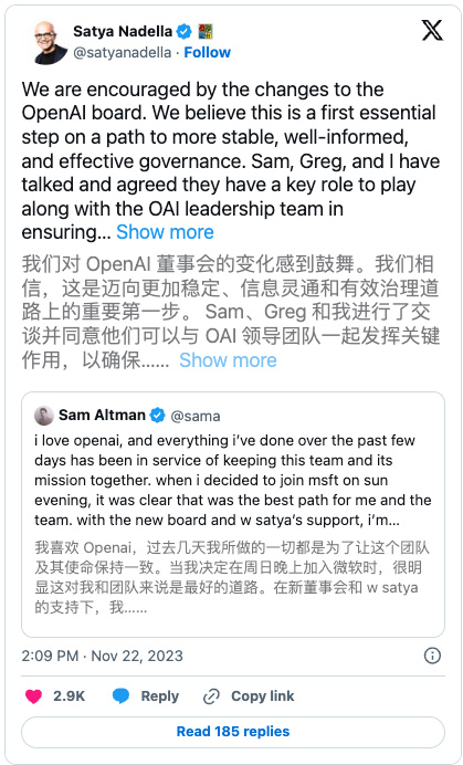 Altman和微软首席执行官萨提亚·纳德拉(Satya Nadella)都相继发帖。Altman在X上发帖写道:“我喜欢OpenAI,过去几天我所做的一切都是为了让这个团队及其使命保持团结。当我决定在周日晚上加入微软时,很明显这对我和团队来说是最好的道路。在新董事会和纳德拉的支持下,我期待重返Openai,并巩固我们与微软的牢固合作关系。”微软CEO纳德拉转发并表示,对这一变化感到鼓舞。