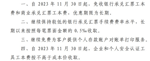 中信银行公告显示,自2023年11月30日起,免收银行承兑汇票工本费和商业承兑汇票工本费,优惠期限为长期;企业和个人安全认证工具工本费按不高于成本价收取。